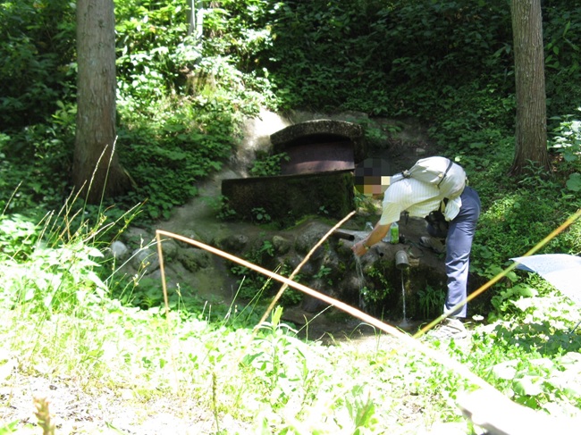 日よけに雨傘をさして先を行くと、道沿いの森から湧き水を見かける。