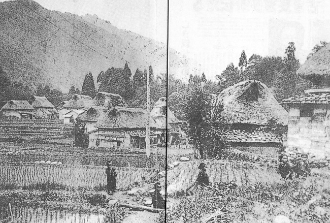 (注・元伊折住民の酒井ハリさんの私家本『おかげさまに生かされて』(昭和63年)収録の写真。写真説明に、6月24日の添え書きがある。水田、藁ぶきの家屋、着物の子供たち、背後の山並みに山間地の農村らしさが見て取れる)