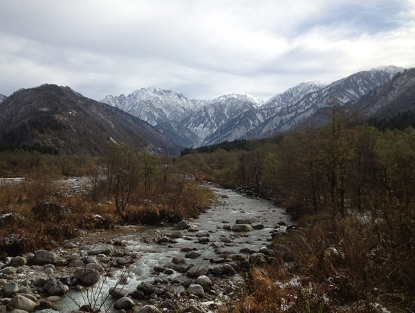 (伊折橋から早月川の先に12月の剣岳を見る。伊折の集落は右手)