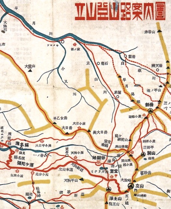 (立山川沿いに室堂乗越を経て室堂へ出る山道が記された昭和10年の地図=注4)